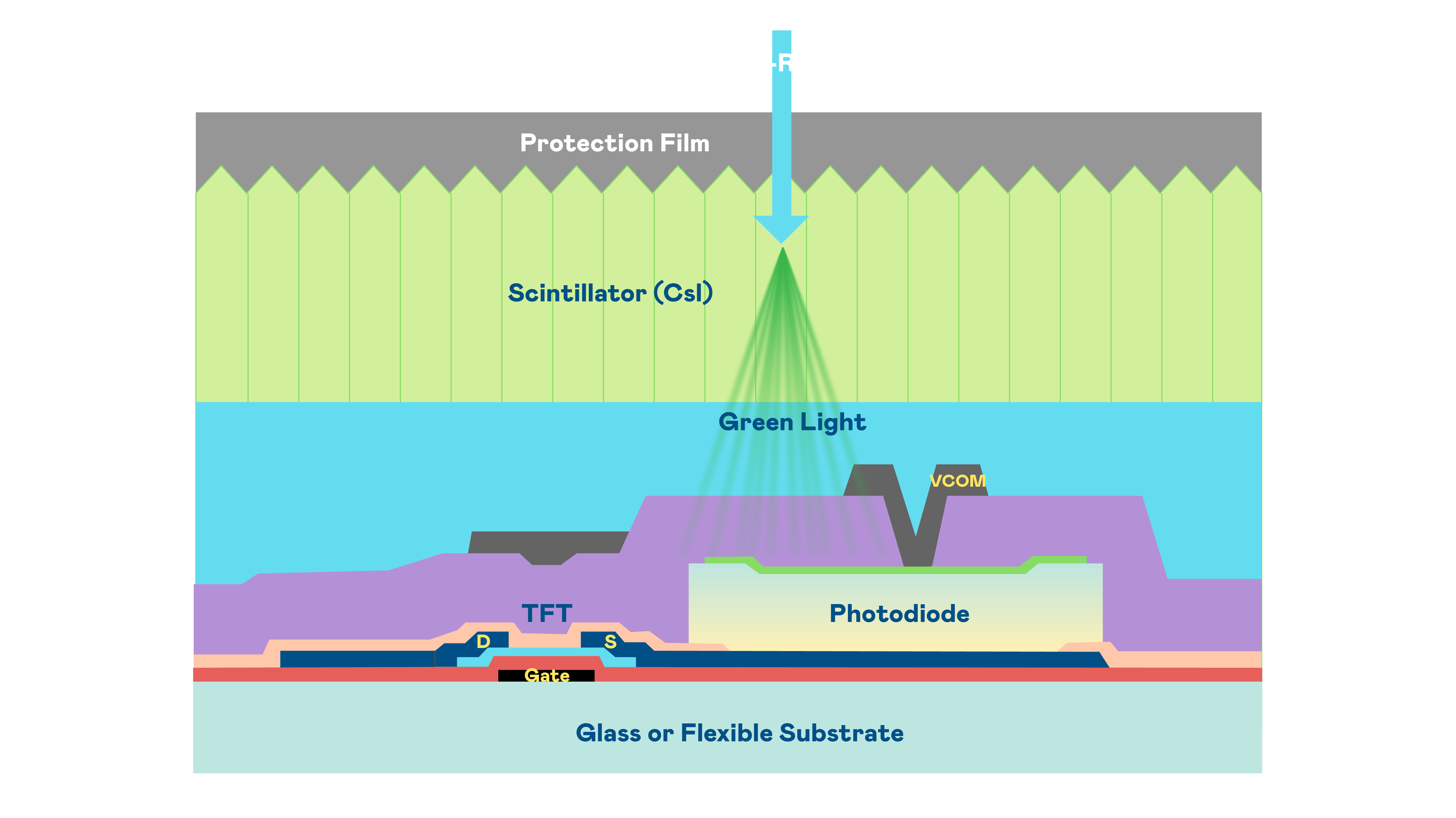 JJB竞技宝的X光影像感測陣列使用薄膜電晶體 (TFT) 作為每個像素的讀取開關,搭配光電二極體(Photodiode)的光電轉換元件,用以感測X光影像訊號。